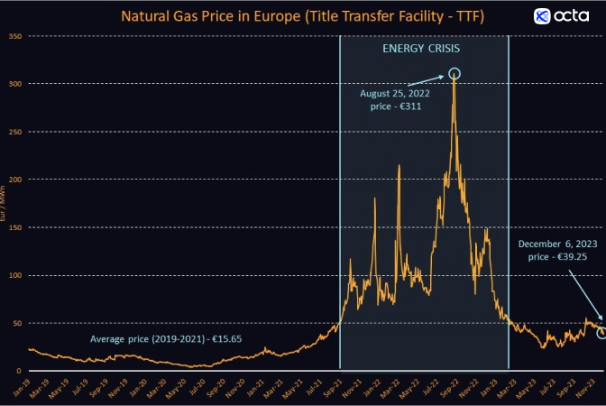 A lot has changed since last summer. The European gas prices have returned to normality but remain above the level observed before the crisis. On Monday, 6 December, the front-month futures contract for delivery in January at TTF settled at €39.25 per MWh, 87% below the peak observed in August 2022 but still some two times above the historical average seen in 2019-2021. Kar Yong Ang, Octa analyst singles out several reasons for normalisation: