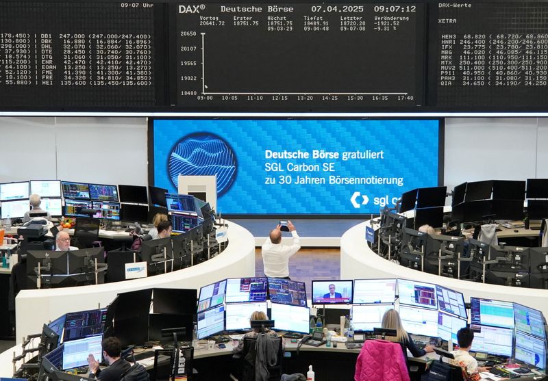 (Reuters) -European shares plunged to a 16-month low on Monday as investors grappled with the possibility of a recession after U.S. President Donald Trump showed no signs of letting up in his aggressive trade war.